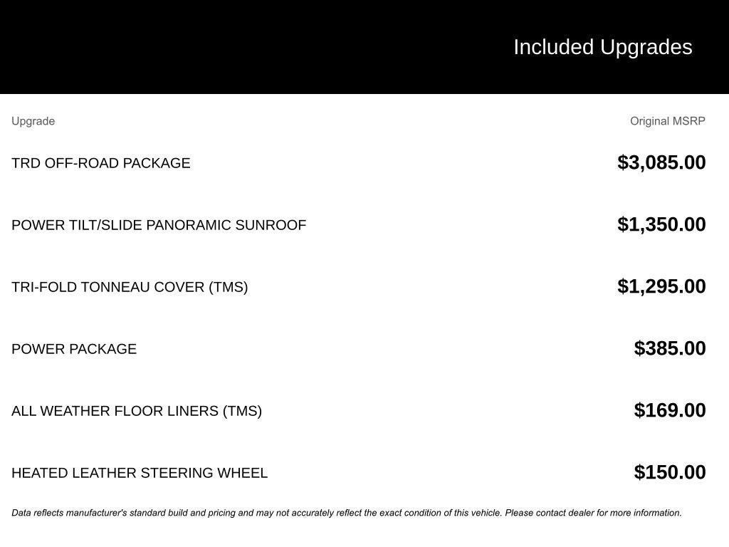 - TRD Off-Road Package (Wheels: 20 Black Alloy, Black Grille w/Chrome Surround, Multi-Terrain Back Monitor, Color-Keyed Outside Mirrors, Panoramic View Back Monitor, Under Cover & Protector, TRD Off-Road Suspension w/Bilstein Shocks, Front & Rear Mud Guards, Bedside TRD Off Road Decal)